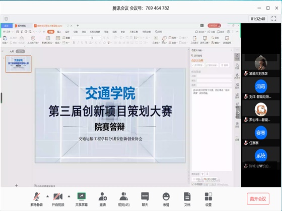 4月28日晚,交通学院举办第三届大学生创新项目策划大赛院赛。本次比赛通过线上答辩的方式举行。交通学院何忠明老师、赵娜老师、肖杰老师和周爱莲老师担任比赛的评委,共计11支队伍参与。此次大赛由院分团委创新创业协会干事郭欣主持。