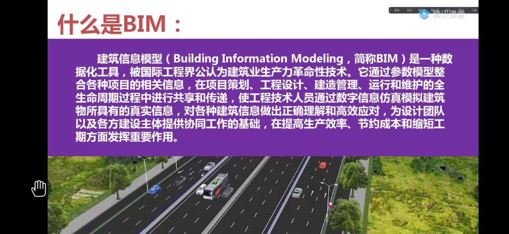 李明顺老师首先对该门课程进行了介绍。课程总共40个课时,分为两部分,一部分为理论部分,其主要涉及BIM在项目管理中的应用与策划、BIM在设计施工阶段的应用、BIM在运维管理中的应用、BIM在项目管理中的协同等相关内容;另一部分为实操上机部分,但是由于受疫情的影响,本部分内容进行延后处理。老师从BIM的含义、我国BIM技术的发展过程以及BIM的主要特点分别进行了详细的讲解,旨在让同学们建立起一个比较完整的BIM概念体系。之后通过两个具体实例与BIM的实际应用,向同学们展示了BIM技术在设计阶段与可行性研究阶段中的重要作用,充分展现了BIM技术的可视性、可载性、共享性等特点。