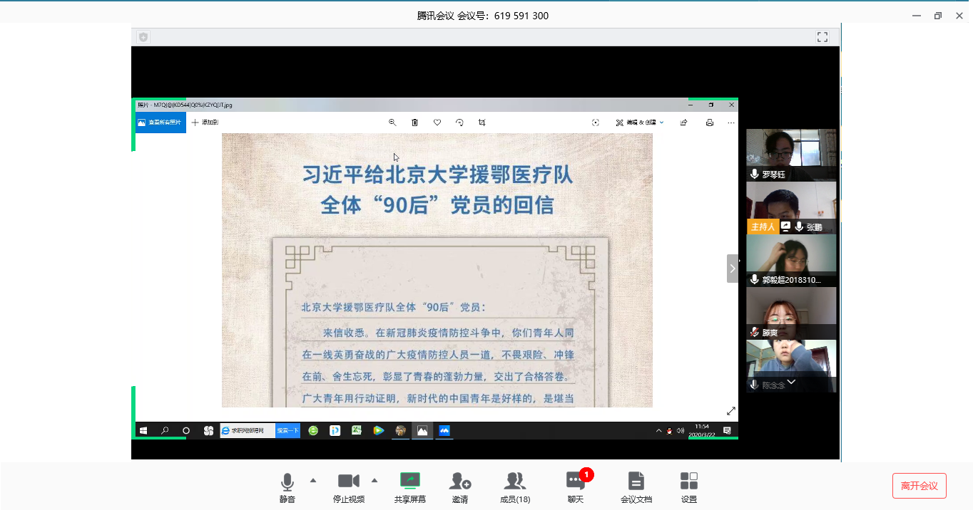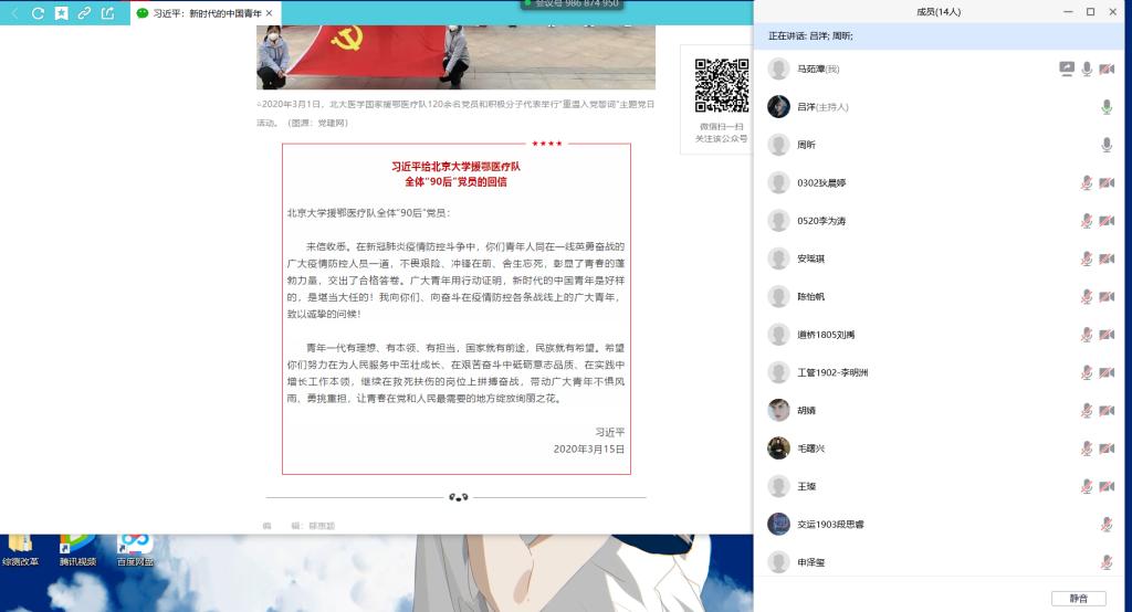 习近平总书记3月15日给北京大学援鄂医疗队全体“90后”党员回信,向他们和奋斗在疫情防控各条战线上的广大青年致以诚挚的问候。3月21日晚,交通学院分团委学生会召开学习习近平总书记回信精神的线上例会。会议由各部门部长主持,全体成员与会。