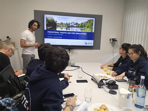 本次交流活动由曾在于利希研究中心交流访问的交通工程专业2012届校友肖尧积极促成。研学团一行走进于利希研究中心高级模拟研究所的超级计算中心,Jens Henrik Gobbert博士详细介绍了欧洲最大的超级计算机JURECA的创办时间、发展历程、未来规划等基本概况,带领研学团参观并介绍机房设备情况。在高级模拟研究所会议室,Lukas Arnold研究员和Mohcine Chraibi研究员分别作了火灾仿真模拟和行人动力学模拟和实验方面的报告。研学团结合各自专业提出了交通车辆控制方面的疑问并开展交流。随后高级工程师Peer Kling及许前程博士为研学团介绍了研究中心的历史发展以及各大研究所概况。