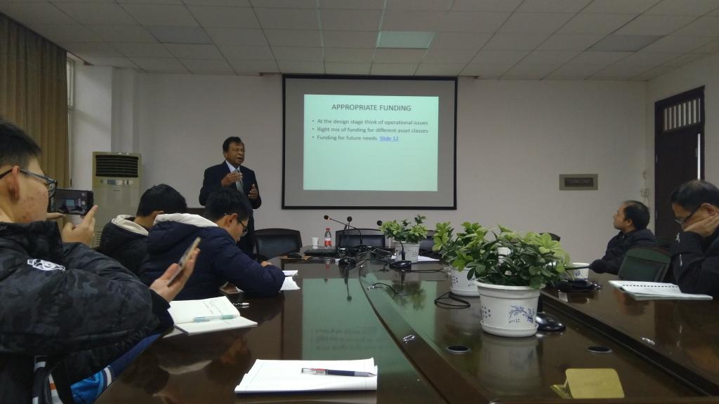 会议开始Sarath Liyanage教授简单地做了自我介绍,解释了最佳资产绩效的含义,进一步指出了在公路交通行业中最佳绩效所涉及的相关内容,并对影响最佳绩效的关键要素做了简洁的说明。Sarath Liyanage教授在报告中阐述了维持最佳绩效所需要注意的地方,如公路修建过程中成本的控制、运营阶段的养护管理、交通规划等方面的成本控制,加深了我们对公路规划的认识。报告最后卢守峰老师咨询了公路桥梁建设的成本问题,Sarath Liyanage教授做出了简明的回答。