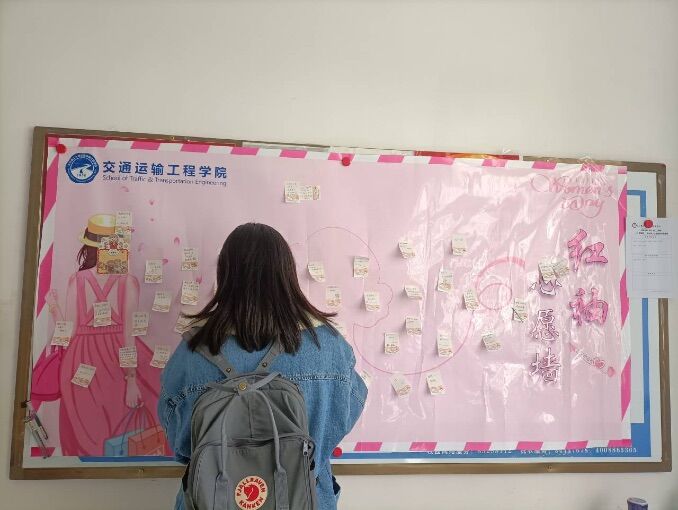3月1日至6日,交通学院学生会外联部组织开展线上投稿活动,交通青年们通过文字视频等方式讲述女性榜样故事,表达对女性的赞美和敬意。学院女生积极投稿各类文章、绘画、书法、器乐演奏作品、手工作品等,充分展现自身闪光点,工管2003班王碧君的文章作品《有个她》、工管1901班辜尚可的绘画作品《母亲的关注》、道卓2001班唐瑾灿的独奏《夕阳箫鼓》等作品获得优胜奖。3月7日和8日,学院分别在金盆岭校区西苑二栋和云塘校区敏行轩的公示处张贴心愿墙,女生们写下心愿,贴上便签,由交通青年们彼此实现,并留下美好祝福。妇女节当天,同学们集思广益,制作精美的贺卡,为身边的女性朋友和长辈送上祝福,表达敬意。