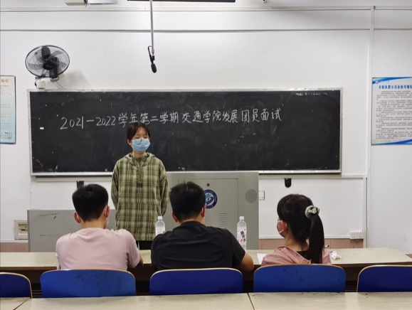 4月24日晚,交通学院于金盆岭校区13号教学楼102教室开展2021-2022学年第二学期发展团员面试。交通学院团委书记彭笠、2021级辅导员史亚杰与团委学生会执行主席狄晨婷参与本次会议。