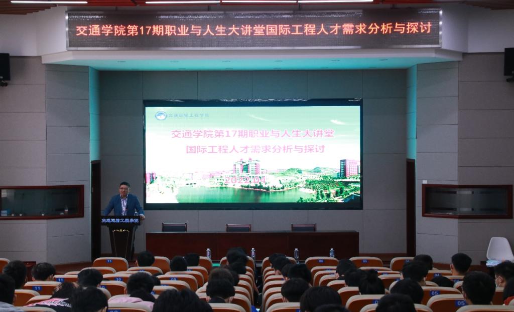 5月4日下午,交通学院于云塘校区工二交通科技报告厅举行第17期职业与人生大讲堂。本次会议邀请到中国港湾工程有限责任公司哥伦比亚波哥大地铁一号线项目总经理部副总经理丁文先生做主题分享,本次会议紧紧围绕“喜迎二十大,永远跟党走,奋进新征程”这一主题。交通学院党委副书记涂道勇,学工办全体老师出席会议,交通学院2019级、2020级部分学生共140余人与会。