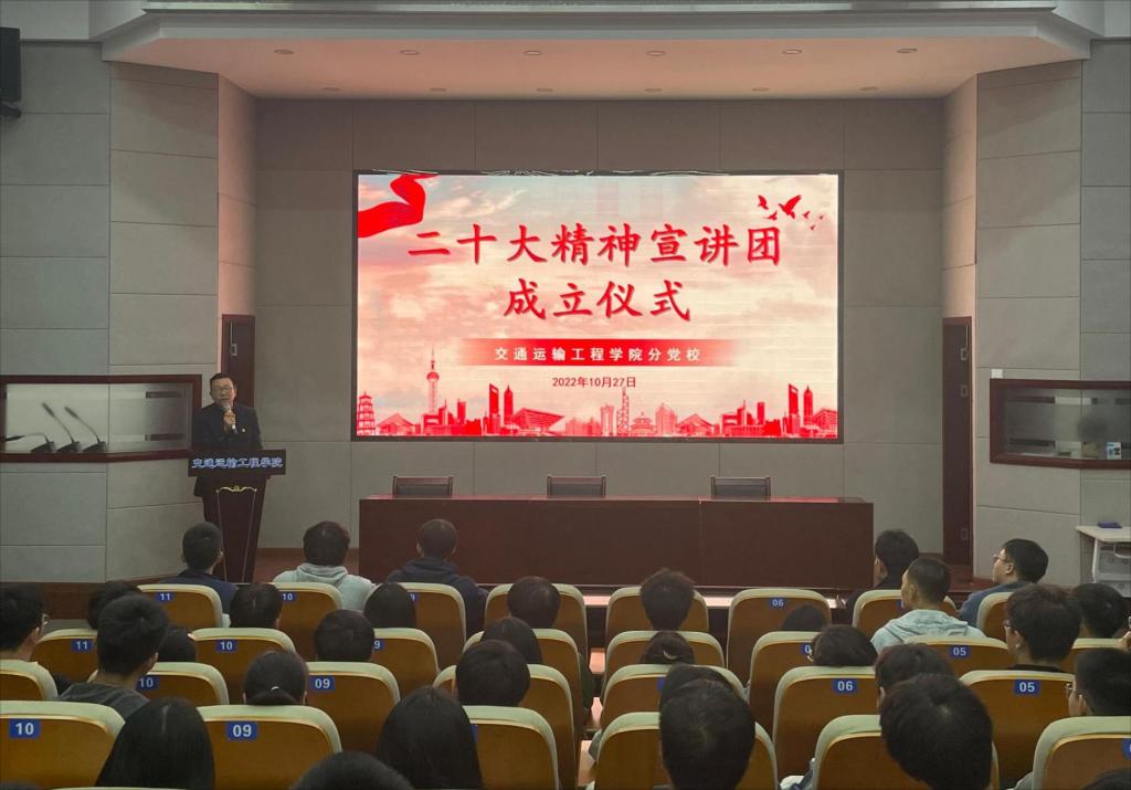 10月27日晚,交通学院党的二十大精神学生党员宣讲团成立仪式在工二交通科技报告厅举行。交通学院党委书记刘朝辉、党委副书记涂道勇、党建辅导员肖敏强和学生党员宣讲团全体成员参加。