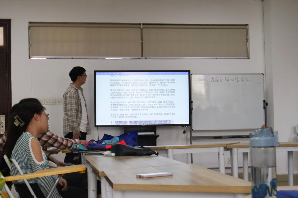 11月10日下午,交通学院在工二B417召开以“加强团队建设,提升工作质效”为主题的研究生学生干部培训会,由交通学院研究生辅导员彭怡峰主讲,交通学院研究生会各部门负责人及部分干事参加。