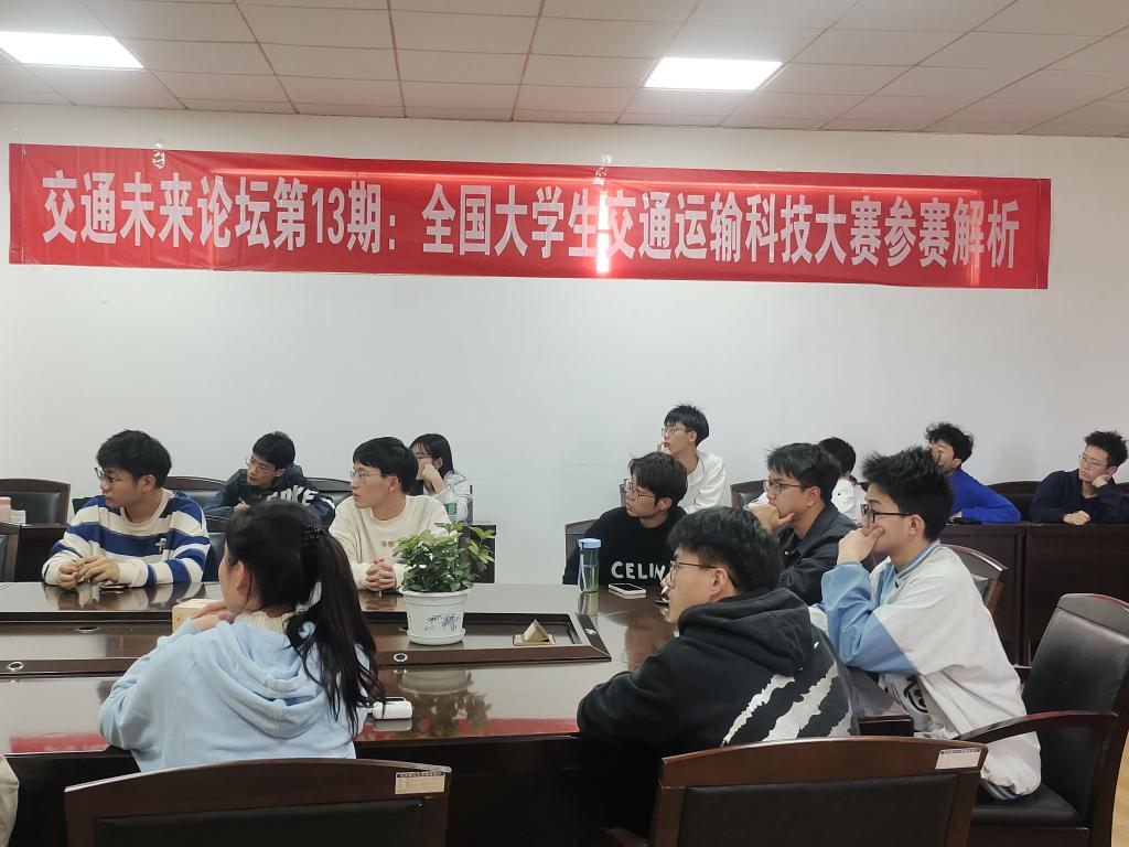 3月14日下午,交通学院于工科二号楼B413举办第十三期交通未来论坛,对全国大学生交通运输科技大赛参赛解析。论坛由交通学院交通工程系老师吴伟以及项目团队代表刘子昂主讲,交通学院党委副书记涂道勇、交通学院团委书记彭笠出席,共50位同学参与。
