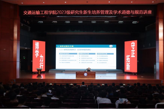 为引导研究生新生合理规划学业,自觉遵守学术道德与规范,9月22日下午,交通运输工程学院在大会堂开展了研究生培养管理及学术道德与规范专题讲座。交通学院副院长高英力教授受邀主讲,研究生培养办刘文琳老师、研究生辅导员周浩老师及2023级全体研究生参加。