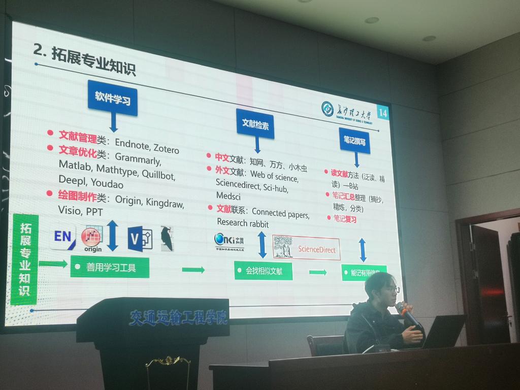 随后,郑廷祥以“文献阅读、头脑风暴”为主题,分享了他在文献阅读过程中积累的经验方法,详细描述了撰写、汇总文献阅读笔记的主要流程,为同学们提供了宝贵的指导经验。随后,他简要地介绍了论文的撰写和修改润色过程,强调了科研过程中基础知识储备的重要性。他指出,在进行科研工作时,充实自己的基础知识是关键,只有打下坚实的基础,才能在学术道路上取得更大的成就。最后,郑廷祥鼓励大家要“脚踏实地,埋头苦干”,发扬交通青年精神,引起了全体同学的共鸣。