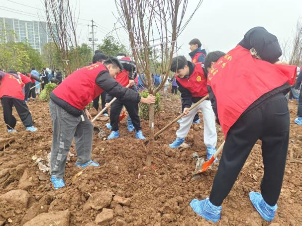 随后,植树活动正式拉开帷幕。天空中虽飘着细雨,却丝毫未减师生们的劳动热情。同学们分工协作,默契配合,挥锹铲土、扶正树苗、培土围堰、提水浇灌,每一个步骤都做得一丝不苟。在大家的共同努力下,一棵棵新栽种的树苗在和煦的春风中昂然挺立,为初春的大地增添了一片生机勃勃的新绿。交通学院的志愿者们还细心地为每棵树苗挂上精心准备的“爱心小牌”,寄托着对绿色未来的期许,也仿佛在这片“青年人才林”中留下了属于自己的成长印记。