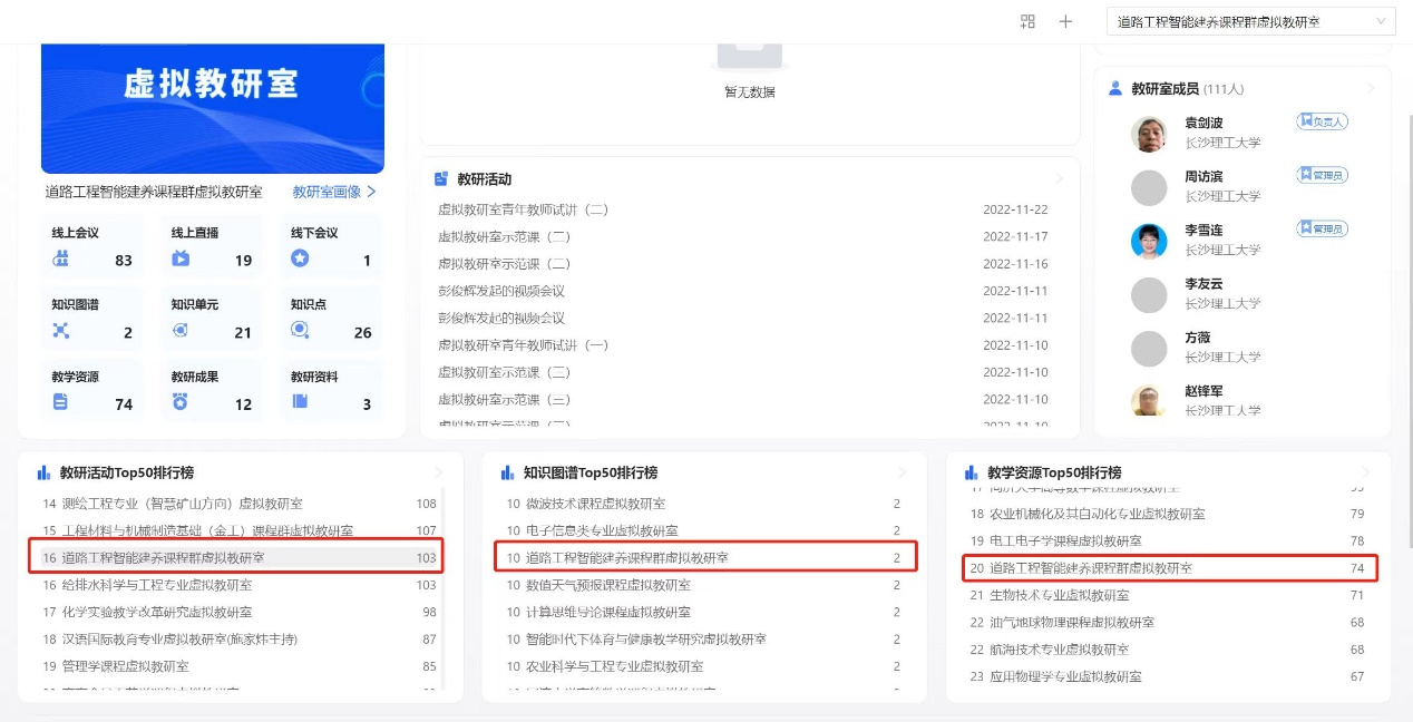 在全国虚拟教研室建设试点教研活动、知识图谱以及教学资源排行榜中,本虚拟教研室均位列前50名次。