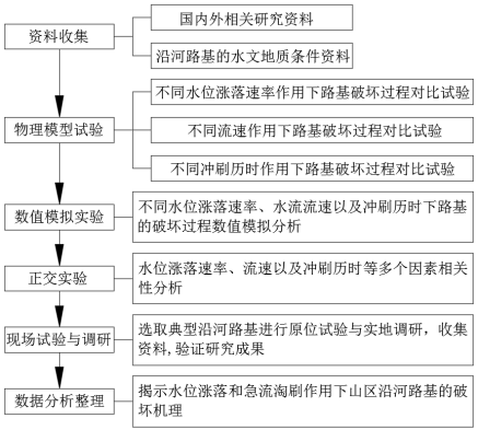 综上所述,沿河路基破坏机理研究方面已取得了不少研究成果,但当前大多从降雨入渗、水位涨落或冲刷等单一角度来进行研究,没能很好反映水位涨落和急流淘刷联合作用下山区沿河路基破坏机理,不利于山区沿河公路安全运营和防灾减灾。
