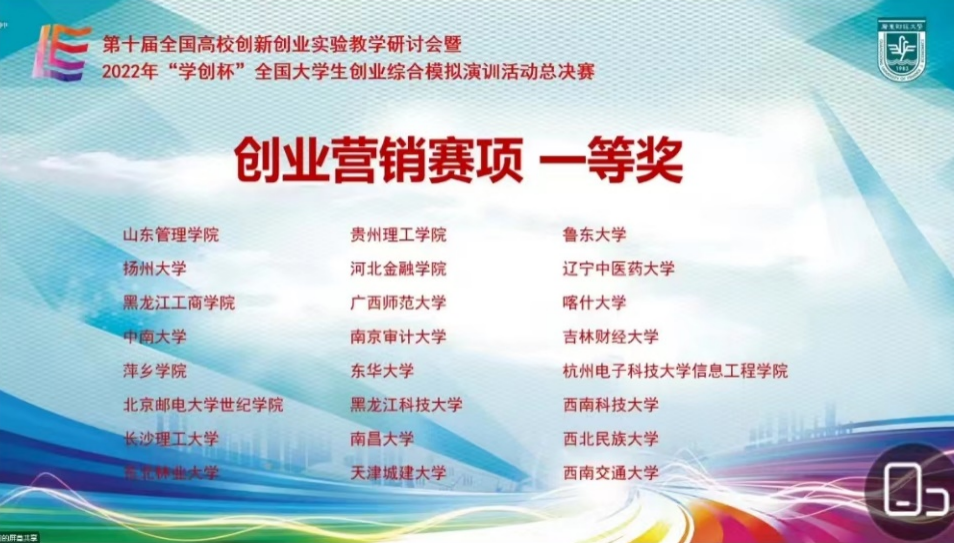 世界杯官网2支代表队分别参加了主赛道和创业营销专项赛道的竞赛,经过与来自北京航空航天大学、中南大学、中山大学、南开大学等高校参赛选手的经过激烈角逐,世界杯官网2支代表队分别获得主赛道和创业营销专项赛道一等奖,开创了世界杯官网在该项赛事的最好成绩。此外我校还获得大赛组委会颁发的“优秀组织奖”。