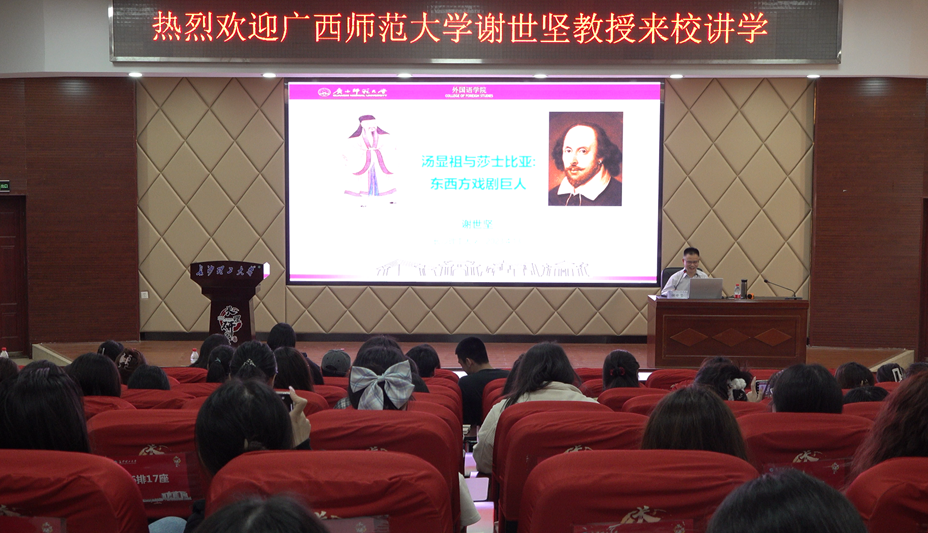 在线买世界杯平台外国语学院“外国语言文学专业前沿系列名师专题课”于2023年4月13日晚19:00在云塘校区文科楼圆厅A200拉开序幕。广西师范大学外国语学院院长、博士生导师谢世坚教授,讲授题为“汤显祖与莎士比亚:东西方戏剧巨人”的专题讲座。在线买世界杯平台外国语学院党委副书记周芳、副院长季红琴、教师代表胡珍铭、张鑫璐、王艺以及学生120余人参加了本次讲课。本次讲学由外国语学院副院长季红琴主持。