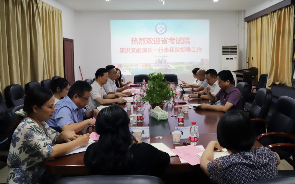 9月4号下午,为促进我省高等教育自学考试健康发展,充分发挥主考学校积极性,保障人才培养的质量,提高自学考试管理水平,湖南省教育考试院康洪文副院长、自考处皮祖迁处长、刘振坤副处长等组成的调研组莅临我院开展自学考试调研工作,我院党总支书记何纯芳、院长邹兴平、副院长向英、刘英姿、谢朝华和自考相关工作人员参加了此次调研座谈会。