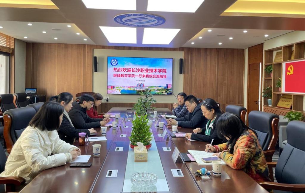 2024年1月11日上午,长沙职业技术学院继教院院长贺超才一行、永州职业技术学院副校长裴有为一行,先后莅临我院进行自考合作交流,分别在金盆岭校区15教四楼会议室与我方进行了座谈。我院副院长谢朝华、自考部主任郭利及自考部相关人员参加了座谈会。