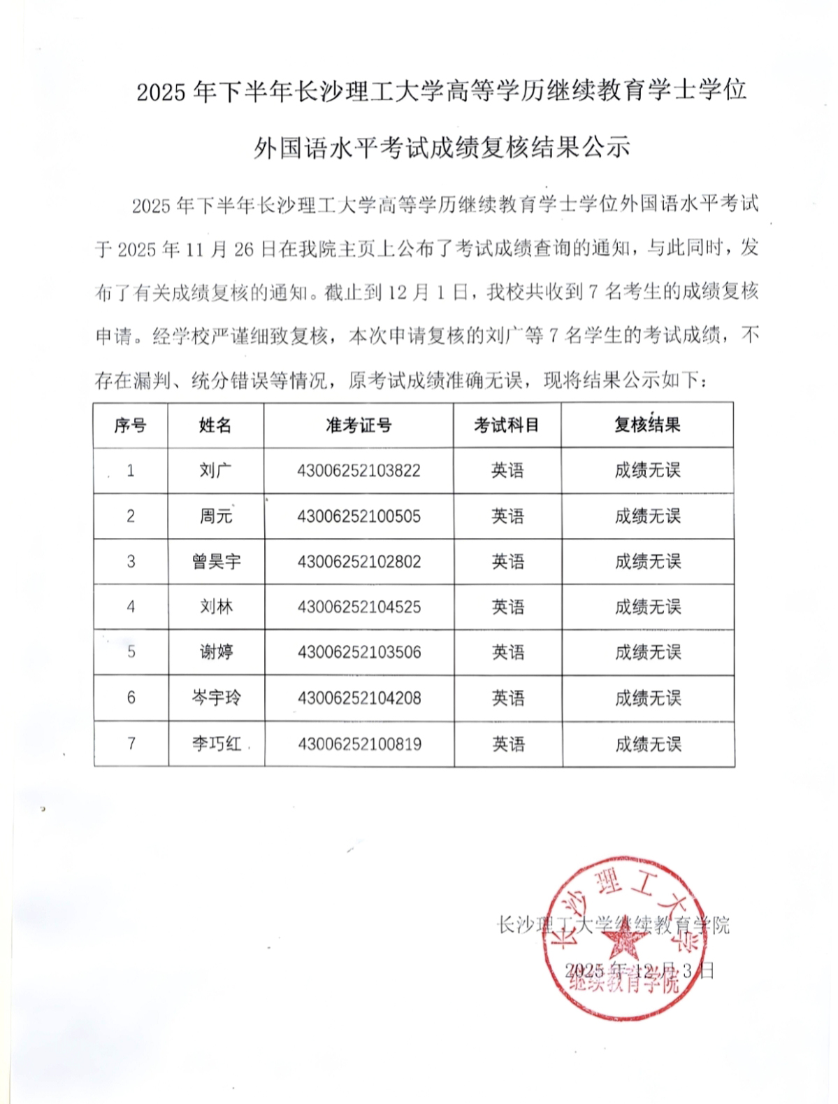2025年下半年在线买世界杯平台高等学历继续教育学士学位外国语水平考试成绩复核结果公示