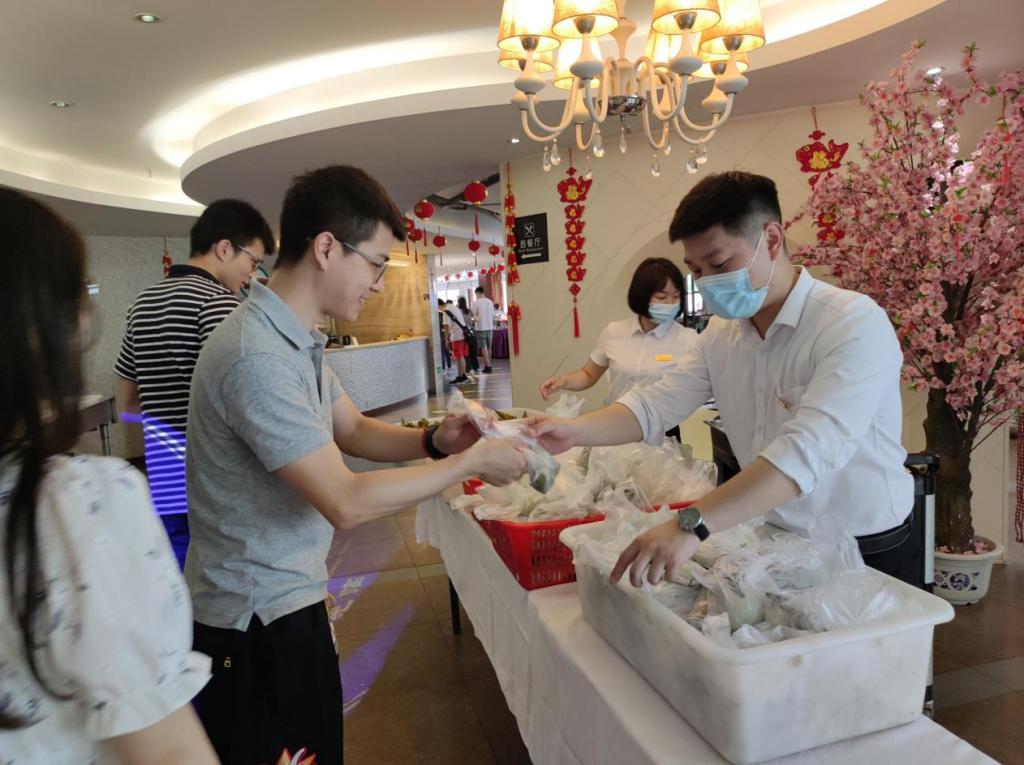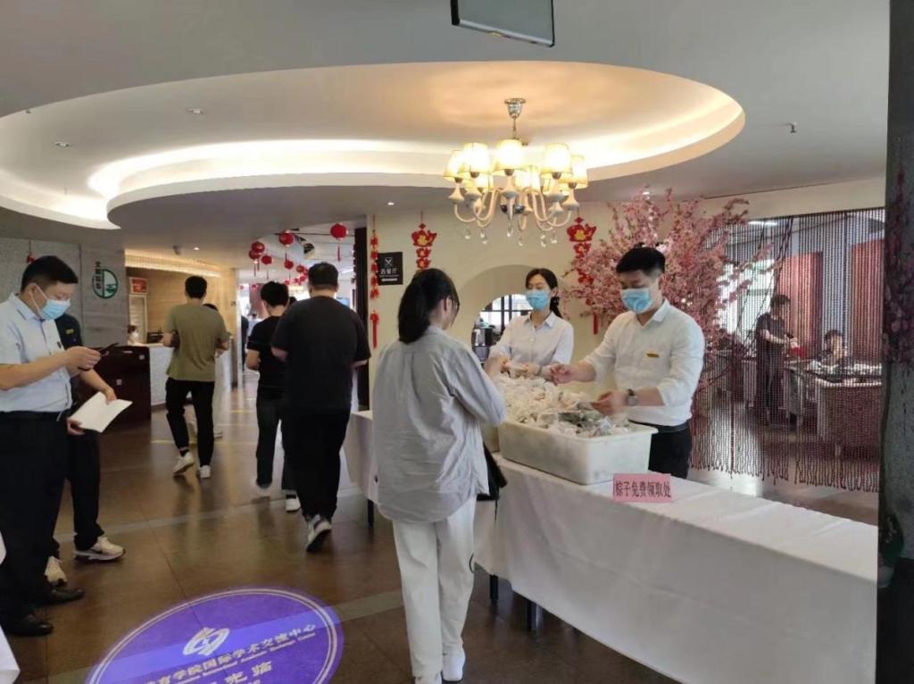为了回馈广大师生对国交的厚爱,纪念端午节,国际学术交流中心从员工中招募“熟练工”,自己采买原材料,手工包粽子,煮熟,于端午节前夕浓情馈赠来交流中心用餐的师生,每人一枚粽子、一枚盐蛋,演绎一份片片“粽”叶情。