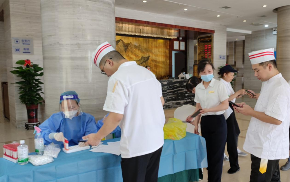 1、总经理谢治强带领管理人员对即将入住的一百余间房间进行全面检查,包括房间设施、照明、墙面、地面、淋浴间等,楼层班组对房间进行精细洒扫、抹尘、消杀,并联合维保部按要求将原来的房型布置成三人间,添加床位,增补物品,对房间设施设备进行修护,有条不紊地进行入住前的准备工作。