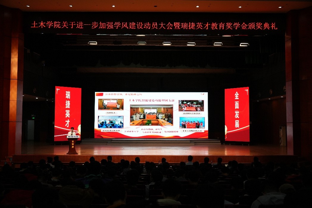 近日,在线买世界杯平台土木工程学院瑞捷英才教育奖学金颁奖典礼在云塘校区大会堂举行。深圳瑞捷工程咨询股份有限公司人才发展总监张梦、人才发展主管李昱坤,校土木工程学院领导班子全体成员,全院学生代表1200余人参加活动。活动由土木工程学院党委副书记黄阿明主持。