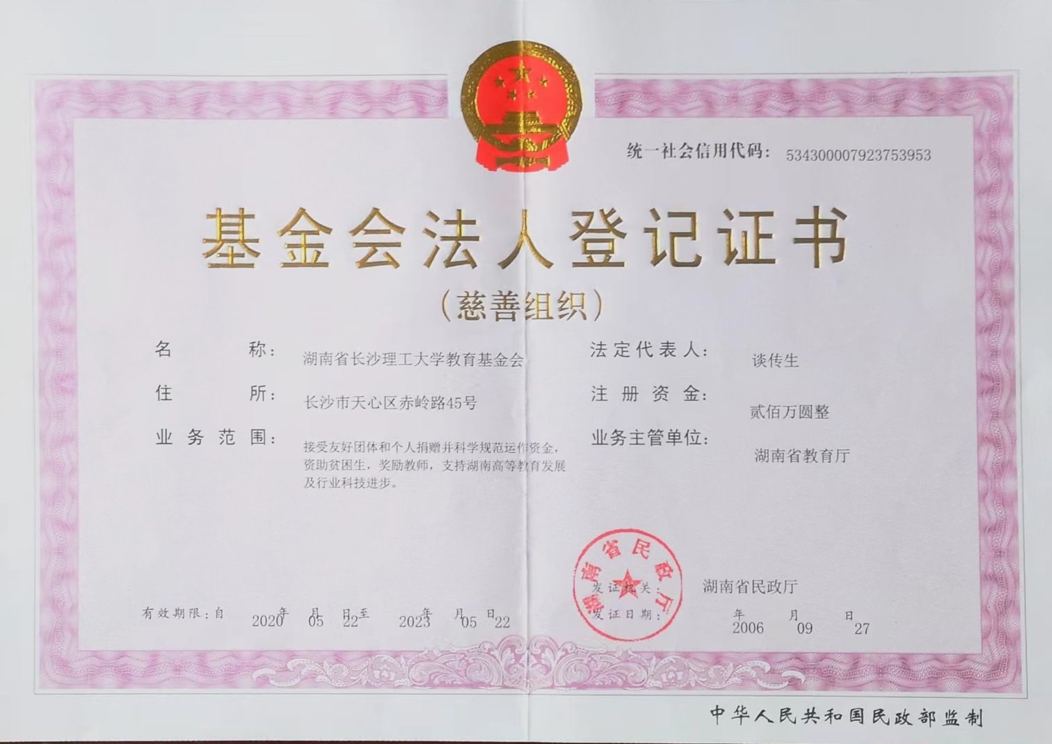 湖南省在线买世界杯平台教育基金会(以下简称基金会),于2006年9月经湖南省教育厅同意,湖南省民政厅批准成立的具有独立法人资格的非公募基金会(慈善组织)2015年取得非营利组织免税资格,2016年取得公益性捐赠税前抵扣资格,可开具公益性捐赠收据,2017年认定为慈善组织,2023年获评最高等级“5A级社会组织”。