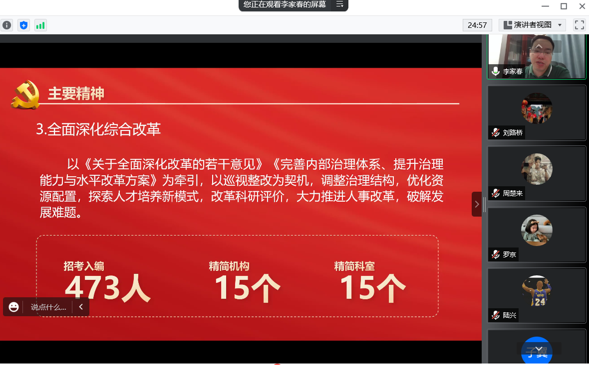 会上,李家春从会议概况、会议召开背景与意义、会议主要精神等三个方面,领学了世界杯官网第四次党代会精神。