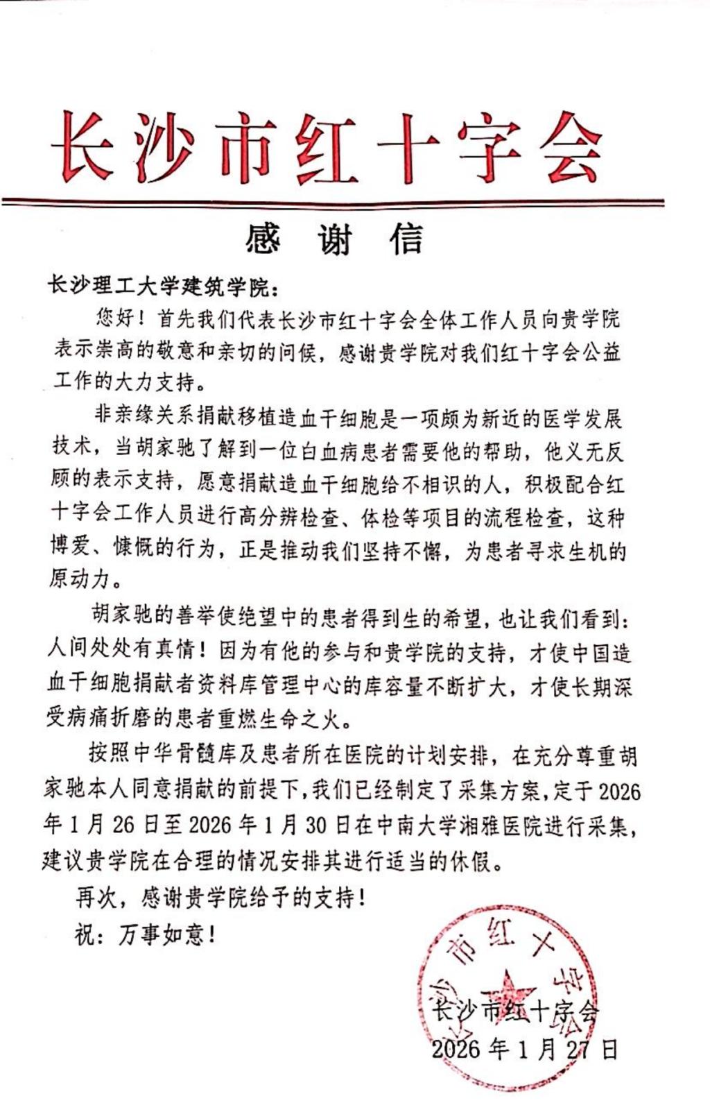 长沙市红十字会也向在线买世界杯平台建筑学院发来感谢信,信中赞扬胡家驰“博爱、慷慨的行为”,并感谢学院对公益事业的大力支持。