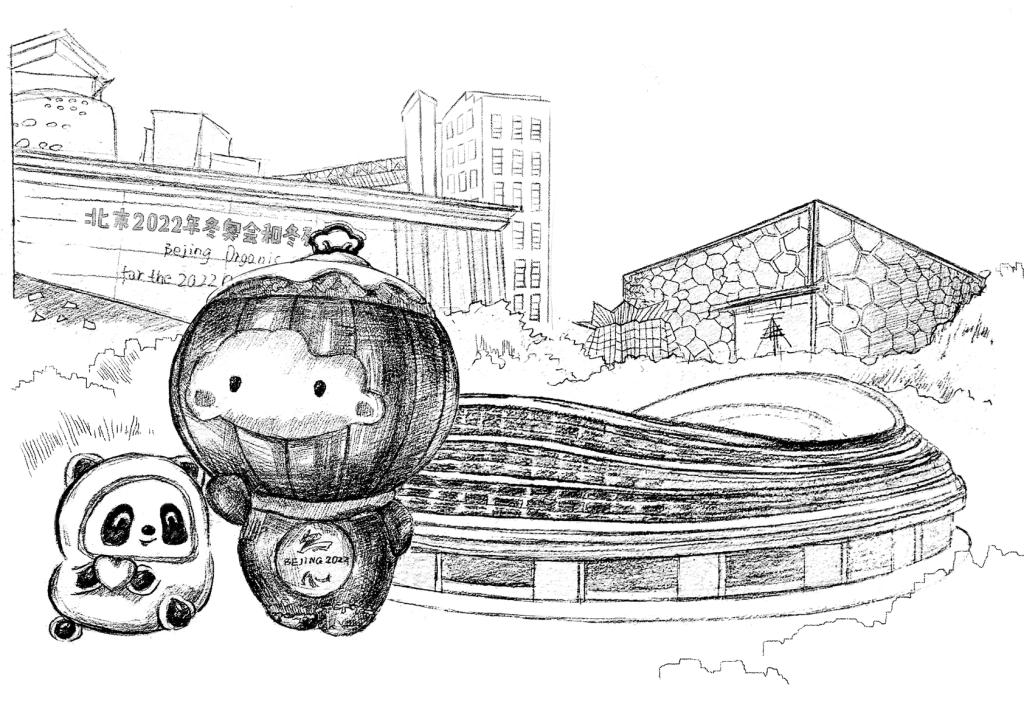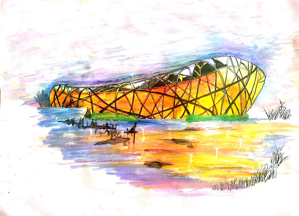 一张白纸,数杆墨笔,笔随心驰,画随意骋,一个个冬奥会场馆的形象就跃然纸上,如镶嵌于林海雪原之间的“雪如意”,又如翩若惊鸿,振翅欲飞的“雪飞燕”,或是灵动飘逸的“冰丝带”,亦或是光影交错中的“冰菱花”。在同学们的独具个性的创意下,场馆融合水墨,走向蓝天,展现出了别样风采。