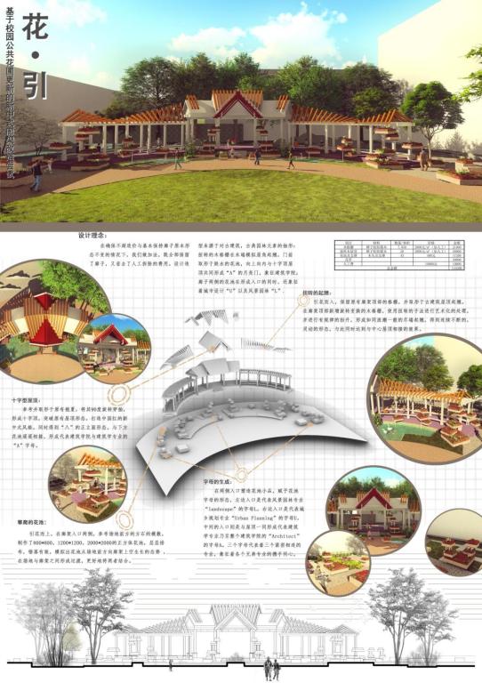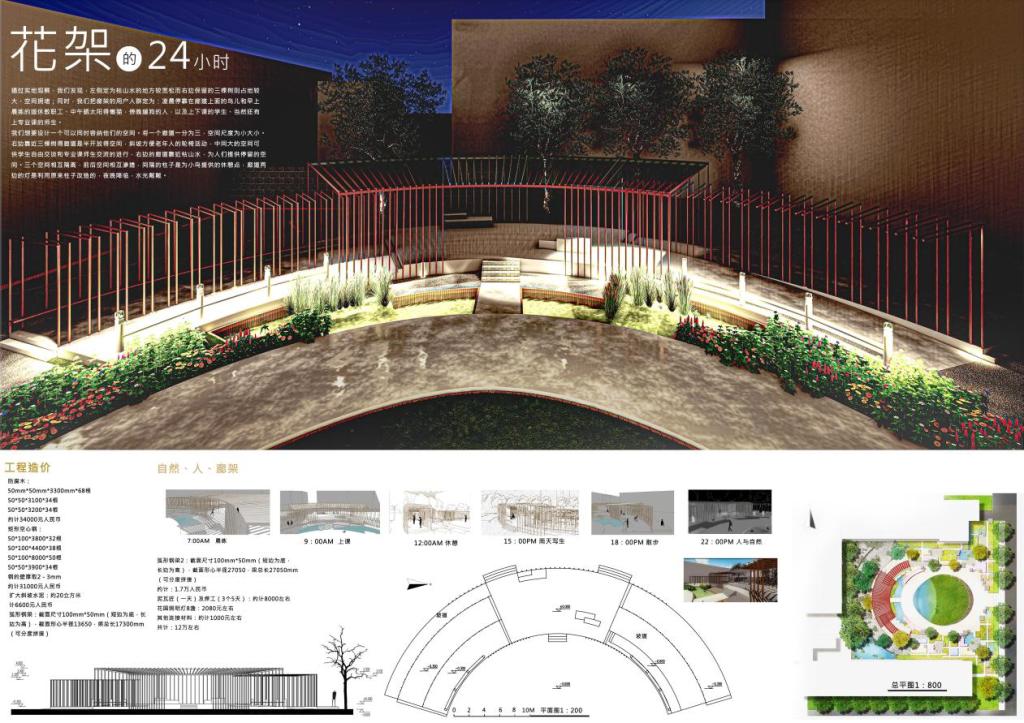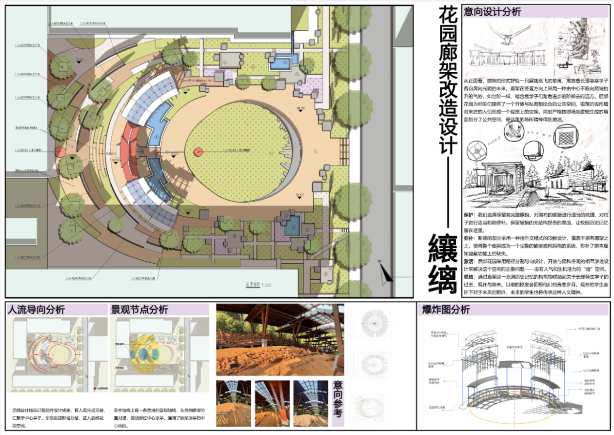 设计说明:为了保留花园廊架原有的文化记忆,设计遵循原先的三段式构架,中间部分为视觉中心,预留较大面积用于同学们交流讨论,前部开敞取景整个广场,后部用若干旋转的格栅门将廊架与之后的景观相隔;左右两部分呈大致对称但细节各不相同的构架,垂直遮挡与水平相交处为圆弧状,同学们可以在上面半躺休息,另外根据空间的围合度差异赋予展览、涂鸦、静思、学习等功能。考虑到原有的花藤长势茂盛,易招引蚊虫,在廊架设计部分区域栽种薄荷、薰衣草等有驱蚊作用的植物。廊架从两边到中间高度递增,增加空间层次。