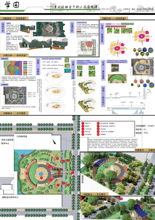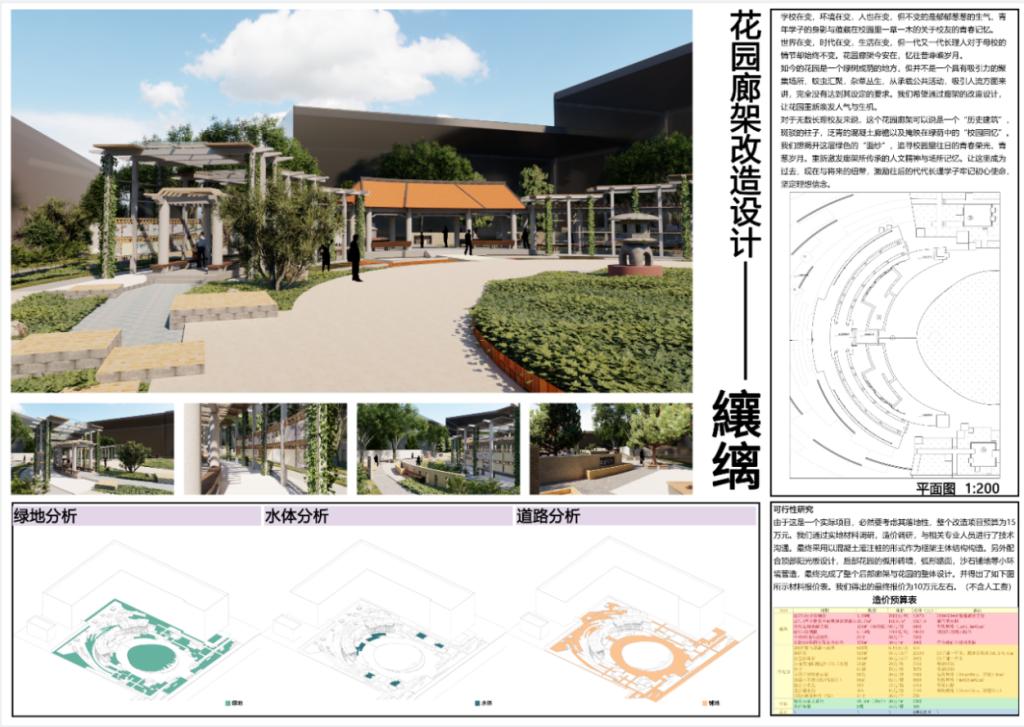 2021年9月,在线买世界杯平台建筑学院面向全院学生公开征集花园廊架更新方案,鼓励大家利用专业知识来参与建设校园环境,也希望大家能在这片学习、生活的土地上留下自己的印迹。此次竞赛中学生自行组队,通过现场调研、现状分析、问题剖析、设计构思、方案表达等多个步骤,对花园廊架进行更新设计。