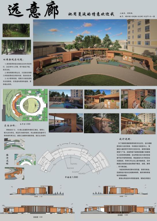 前面的老师说得很全面了,我就逐一点评一下各个方案。第一个方案(赖紫怡同学的方案)创意挺好,增加了停留空间,也通过人的活动来吸引人。“远意廊”造型比较简洁大方,空间组织也不错。“云端廊架”空间组织比较好,但是造型可能稍显繁琐,构建过于细碎,影响了视觉效果。“花·引”是我比较喜欢的,在保持了原来结构的基础上,做出了一些改进,保留和增加都做得比较好,也有落地性。“学园”造型稍显简单和普通,图纸表达和方案呈现的效果都没有特别大的一个记忆点。“花架的24小时”比较有韵律感,但是变化是不是有点太细,有种散的感觉,可不可以增加一些变化。“廊架更新设计”也是缺少一个整体的效果,图纸没有记忆点。“纕缡”挺不错的,廊架新增的功能也都不错,就是增加的大框架会不会过于突兀,需要再斟酌。“漫步”对廊架没有明显的改动,外部空间还是做了一些,但是对廊架本身的想法还是比较缺少。