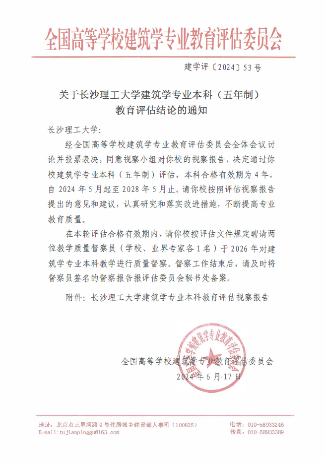 近日,全国高等学校建筑学专业教育评估委员会下发《关于在线买世界杯平台建筑学专业本科(五年制)教育评估结论的通知》(建学评[2024]53号),世界杯官网建筑学专业本科(五年制)顺利通过专业评估,有效期为4年。