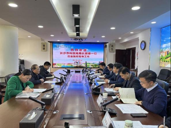 3月6日下午,长沙市科技局党组书记、局长郭塨带领市科技局科技成果与技术市场处、创新发展处相关负责人来世界杯官网调研科技创新工作。校党委委员、副校长钱国平出席会议,科研部门相关人员参加了座谈会,会议由科研部部长王进主持。
