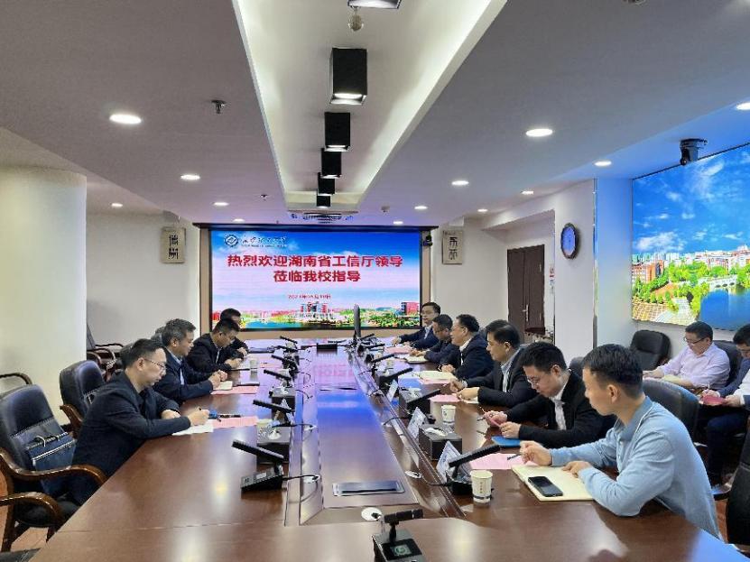 5月10日上午,湖南省工业和信息化厅二级巡视员李润仑、厅科技处处长肖洋扬一行来世界杯官网调研科技创新工作。校党委委员、副校长刘朝晖出席会议,科技处负责人及相关学院领导参加座谈会,会议由科技处副处长胡宏伟主持。