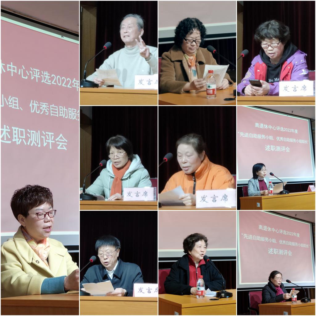 会上,申报先进自助服务小组的10位组长分别从各自小组的微信群、QQ群的规范管理,小组学习,小组活动,小组慰问和困难帮扶工作情况,特别在疫情期间配合离退休中心开展的宣传、引导和组织工作,以及老同志如何发挥自己的余热为学生、为学校百强建设所作出的贡献等方面进行了述职,字字情真意切、句句感人肺腑。