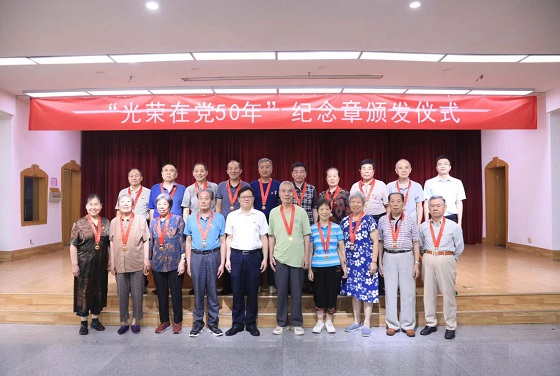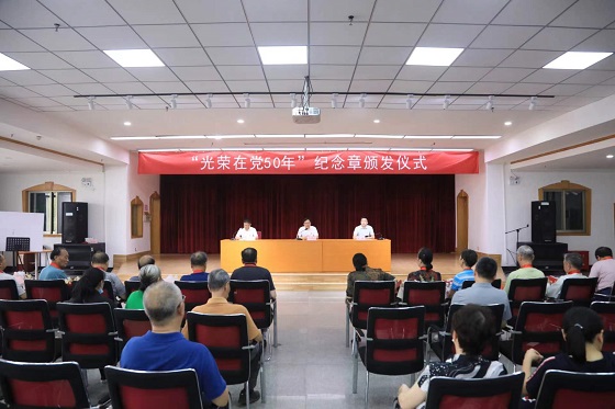 7月5日下午,世界杯官网在金盆岭校区五教多功能厅举行“光荣在党50年”纪念章颁发仪式,学校党委副书记刘建民、组织部常务副部长陈曦出席仪式,为24名党龄达到50年的老党员颁发纪念章。仪式由离退休教职工党委书记徐亮主持,部分老同志代表和离退休中心科职以上干部参加。