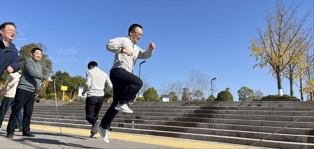 跳长绳比赛在湖畔广场率先点燃活动激情。各工会小组组成参赛队伍集团作战,参照校运会比赛规则,以2分钟全队跳过的人次数总和为比赛成绩。各组队员紧张有序,首尾相连,鱼贯而入,依次跳跃,充分展现了高度的集体荣誉感和团队协作精神。广大观众既为配合默契、无缝衔接、姿势优美的队员鼓掌欢呼,也给予紧张退避、踩错节奏的队员加油鼓劲。队员们竭尽全力,观众和队友们时而赞叹,时而惋惜,比赛活动竞争激烈又温情四溢。经过紧张热烈的比赛,最终第三工会小组(德法概论组)获得第一名,第二工会小组(纲要概论组)获得第二名,第一工会小组(原理行政组)屈居第三名。