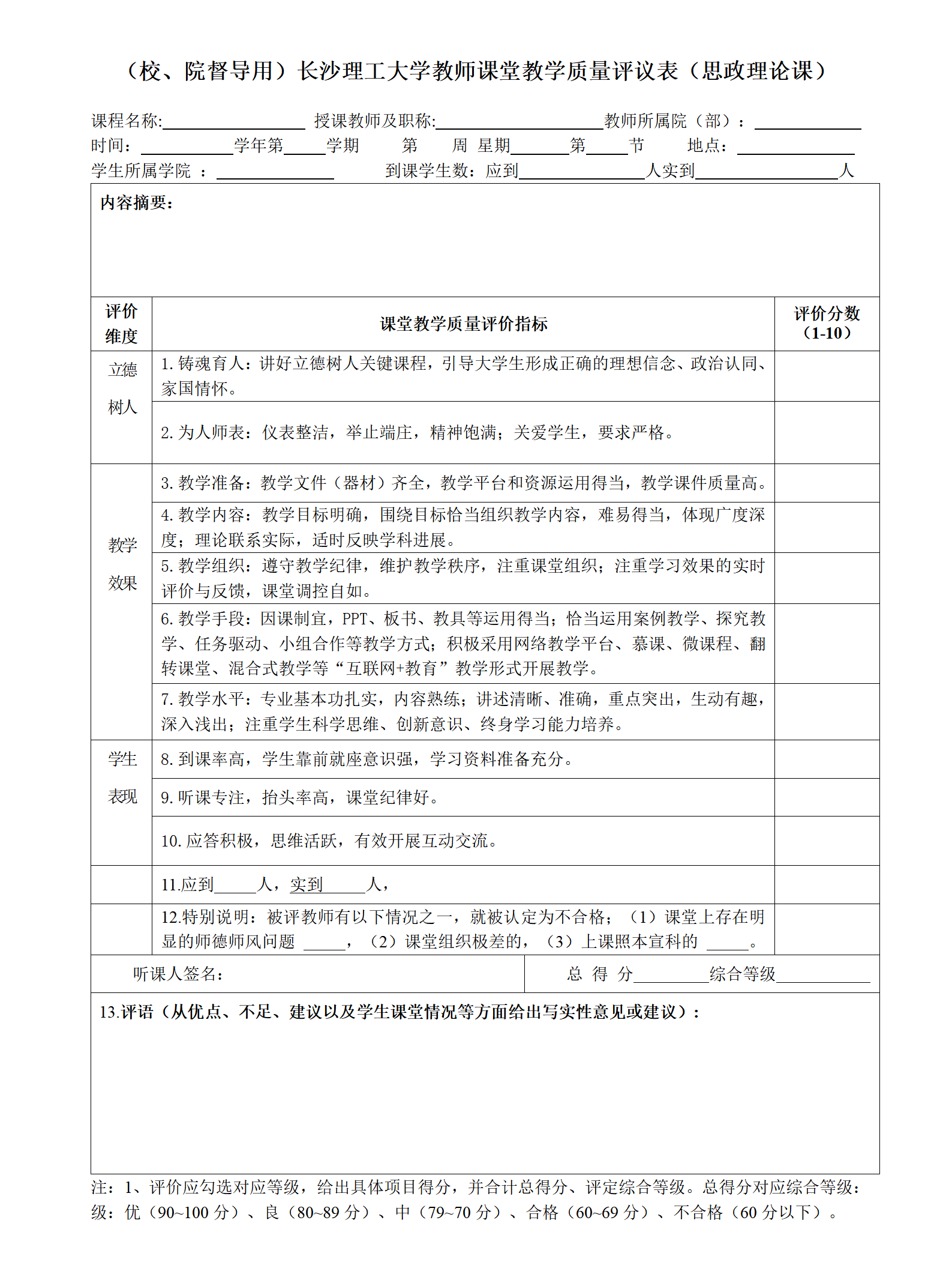 在线买世界杯平台教师课堂教学质量评议表(思政理论课)