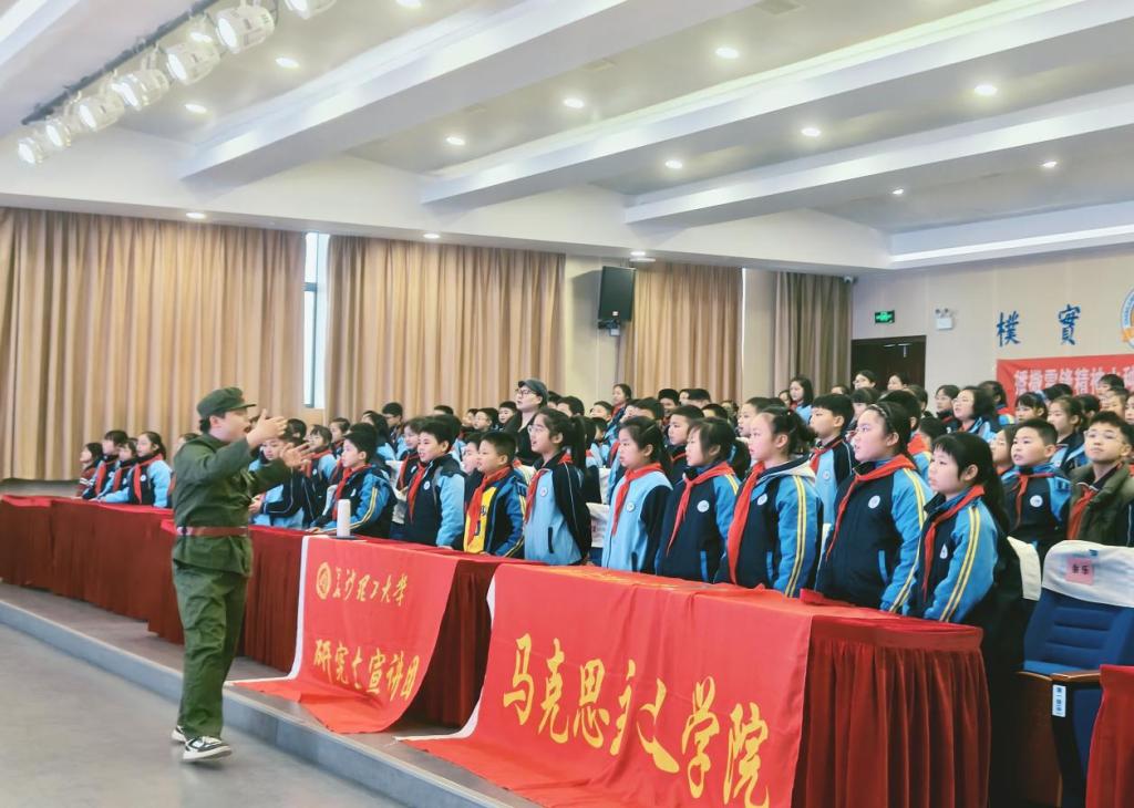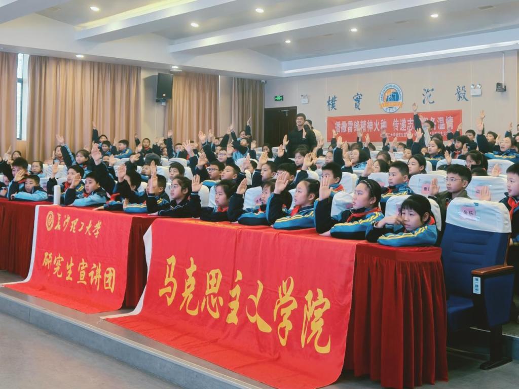 2026年3月26日下午2:20,在线买世界杯平台研究生宣讲团走进天心区长郡外国语第一附属小学,为四年级300余名小学生带来了一场别开生面的“学习雷锋精神,争做新时代好少年”主题宣讲活动。活动现场气氛热烈,同学们展现出高度的热情与良好的纪律,在与宣讲团的深度互动中,深刻感悟雷锋精神的时代光芒。