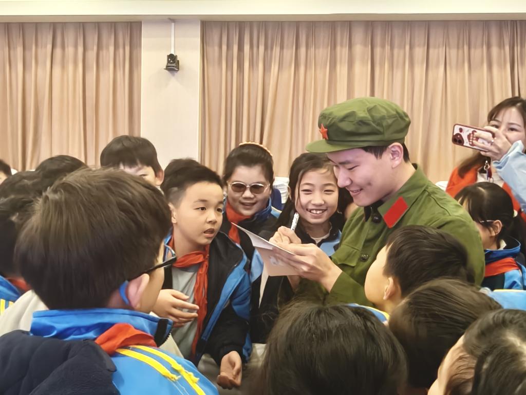 最后,是有奖问答环节。同学们思维活跃,争相举手抢答,现场秩序井然又热情澎湃。活动的尾声更出现了令人动容的一幕:同学们不仅围着演员们抢着合影留念,更纷纷拿出本子,簇拥着剧中“雷锋”的扮演者,真诚地索要签名,将这位“偶像”的榜样力量深深铭记。