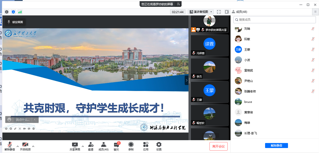 为进一步加强班主任、研究生队伍建设,充分发挥专业老师在专业学习引领与思想政治引导方面的作用,能动学院于4月10日晚7:30,组织开展日常管理、学风促进线上会议,学院党委副书记、副院长张晓烽,副院长孙小琴,全体学工办成员,全体本科生班主任、研究生导师参与本次会议,会议由罗亦欧主持。