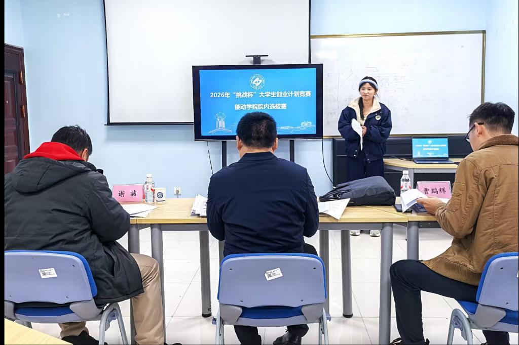 3月17日下午,能源与动力工程学院在新能源大楼2栋503会议室举办2026年“挑战杯”大学生创业计划大赛院内选拔赛。学院教师彭飞、曹鹏辉、谢喆担任评委,共8支队伍参加答辩。