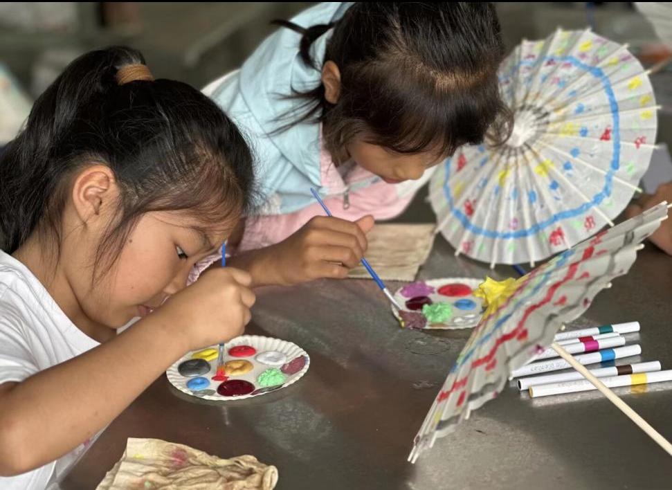 在动手实践环节,实践团队员们提前布置好场地,为每位孩子分发了油纸伞坯、画笔以及各色颜料。在队员们的耐心指导和示范下,孩子们仔细观察了上色的基本技巧,随后便投入到自由的创作之中。孩子们充分发挥想象力,在素雅的伞面上尽情挥洒色彩。有的描绘花鸟鱼虫,有的勾勒山水意境,有的尝试抽象图案,一把把普通的伞坯逐渐被赋予了个性化的艺术生命。支教团成员们穿梭其间,及时给予指导和鼓励,现场气氛热烈而融洽。