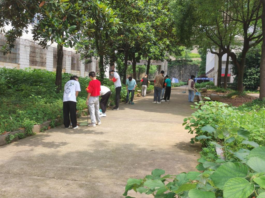 “劳动最光荣“。西苑十栋地势偏低,接邻荒草地坪、马路。由于位置偏僻,少有人关注。地坪上多有塑料瓶、食品包装袋,马路上常见烟头,烂树叶,打扫不易。志愿者们都自带劳动工具,认真仔细打扫,在志愿劳动的过程中,同学们从中体验劳动,积极参与。