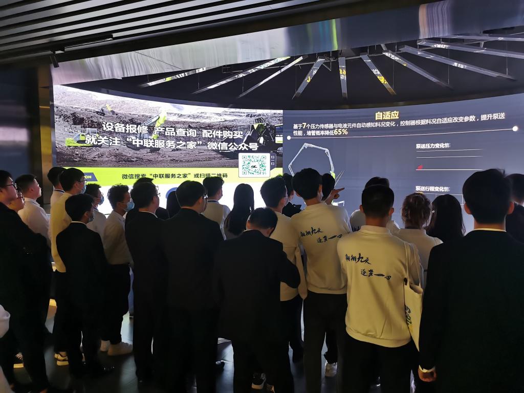 巴士参观结束后,同学们跟随中联重科工作人员来到了中联重科工程机械馆参观,通过场馆中间的投影设备,观看3D宣传视频。了解了中联的发展历程,智能制造技术与设备、智能化工程机械、控制系统及部件,以及工业互联网技术及应用场景、工程机械大数据、物联网工程应用等先进设备的使用情况。