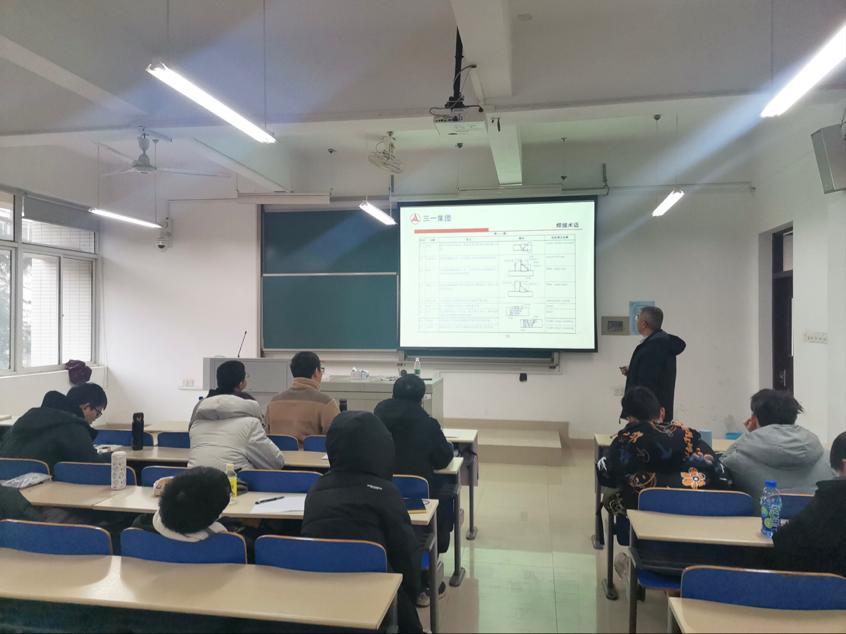 2020年12月15日下午14:00,在在线买世界杯平台云塘校区工科一号楼B213开展了三一集团与在线买世界杯平台校企联培智造班教学第七课:八大工艺类基础课程——焊装,本次教学课程由三一集团泵送事业部泵送公司工艺所一级工程师黄清平老师主讲,黄清平老师有多年工艺及实操经验,为大家带来了一堂扎实丰富的焊装基础课程。