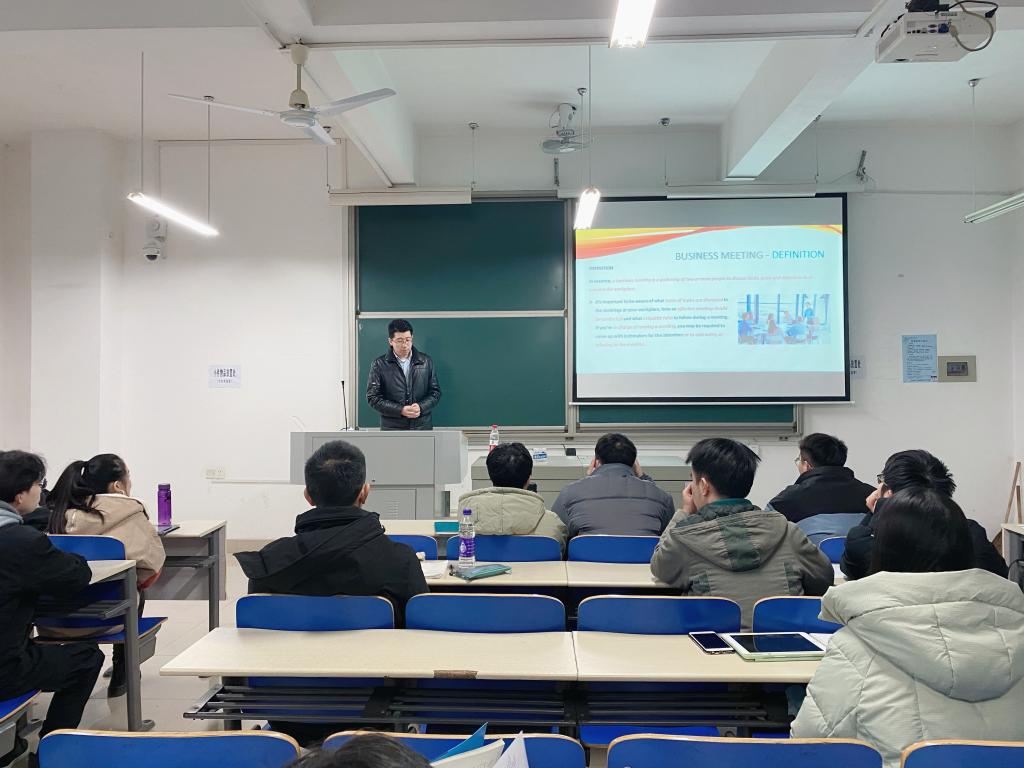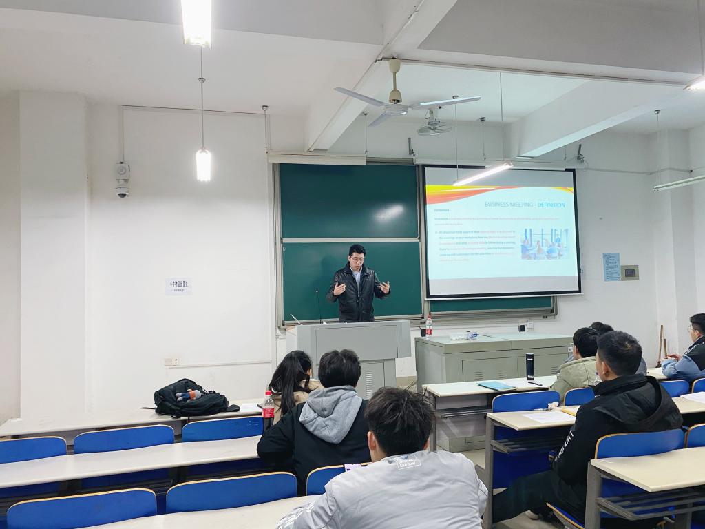 2020年12月23日18:30,三一集团与在线买世界杯平台联培国际班第八次培训课程在工一B212举行。本次课程由三一集团泵送事业部国际营销公司营销管理部国际营销经理梁贺新主讲,主题为“专业英语(会议)”,国际班十八名学员参与了此次培训。