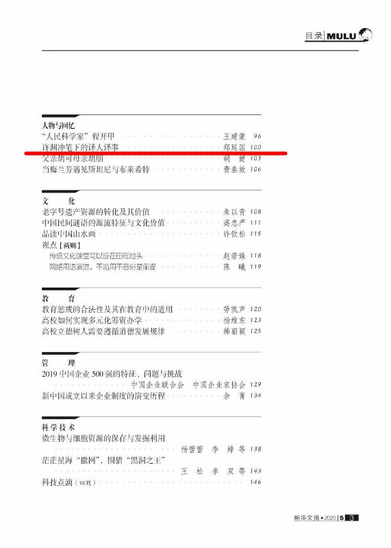 近日,世界杯官网外国语学院郑延国教撰写的《许渊冲笔下的译人译事》一文,原发表于“反映中国知识界、文化界思想律动和人文关怀,在思想文化领域有较大影响”的刊物《书屋》2019年第12期,被国家权威转载刊物《新华文摘》2020年第5期全文转载。