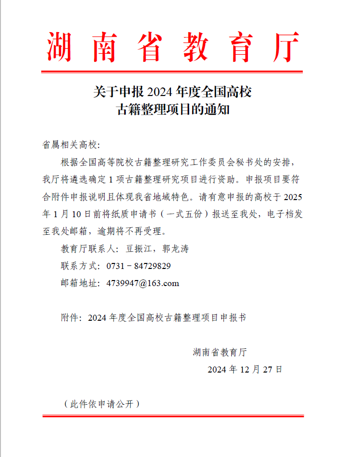 《关于申报2024年度全国高校古籍整理项目的通知》已转发,请老师按照申报通知要求填报,并于2025年1月8前将纸质申请书(一式六份)报送社科处,电子档发送至指定邮箱(1430893250@qq.com).