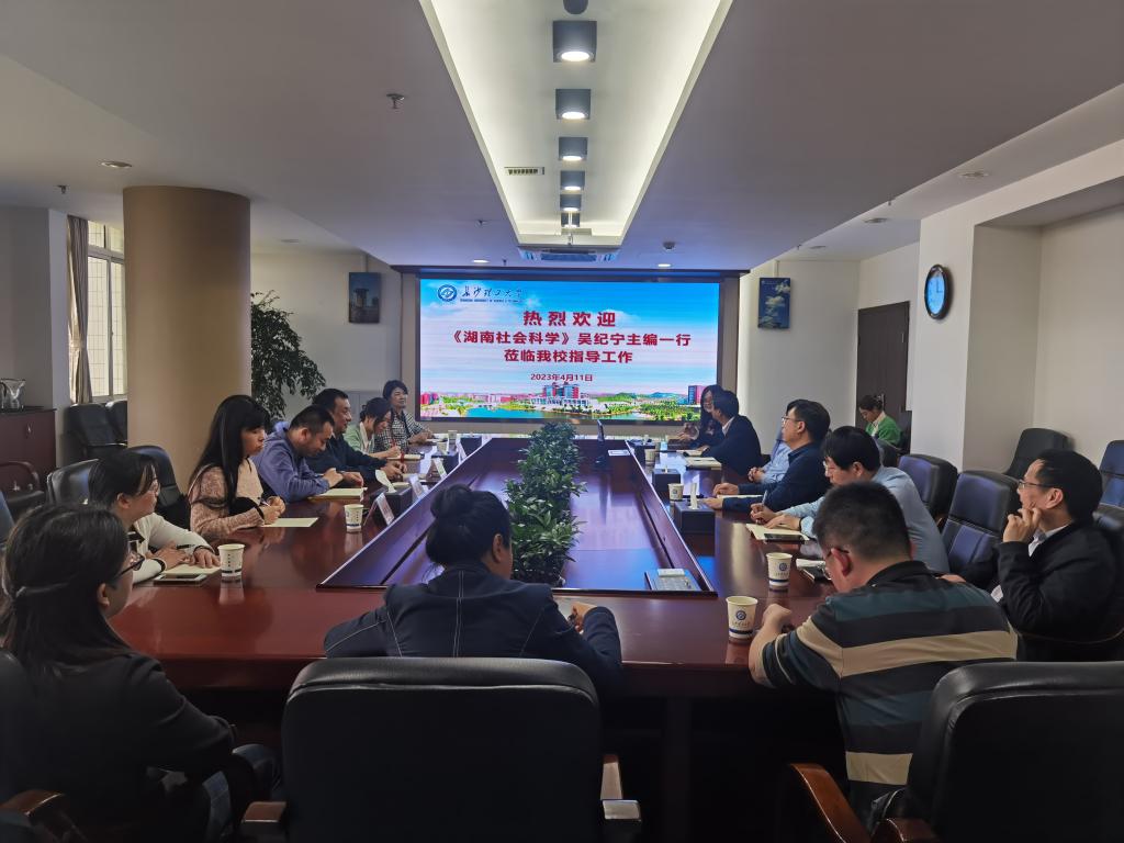 4月11日下午,《湖南社会科学》主编吴纪宁一行4人来世界杯官网座谈交流,副校长刘朝晖出席座谈会。社科处处长刘建江、副处长郑咏梅,期刊社社长王宏、副社长陈浩凯,经管学院、艺术学院、文新学院、外语学院、马克思主义学院、法学院等相关学院科研副院长和教师代表参加座谈。